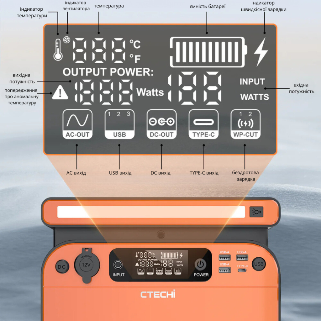 Портативна електростанція CTECHi 518 Втч/500 Вт, батарея LiFePO4, 144000 мАч – Надійне автономне джерело енергії для дому, кемпінгу чи подорожей — CTECHi 518 Вт·год / 500 Вт (модель GT500) із батареєю LiFePO₄, численними виходами та підтримкою заряджання від сонячної енергії.